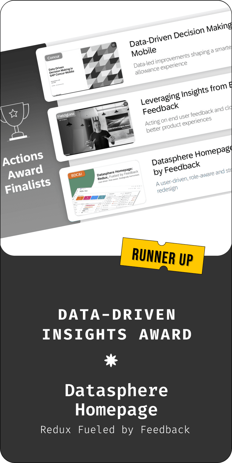This project was seen as a perfect example of harmonised working model between UX, Research team, UA, PM and Development team and was recommended by the Product Lead to be nominated for SAP Data-Driven Insights Awards, which later successfully received a runner-up position.